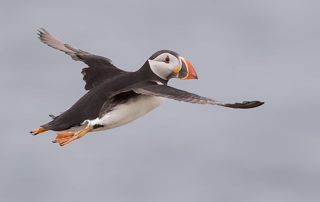 Vliegbeelden van de papegaaiduikers op The Isle of May. De foto linksonder is gemaakt op een klip tijdens een stevig wind. De papegaaiduikers vliegen dan niet zozeer, maar zweven op de wind op zoek naar een geschikte landingsplaats.
